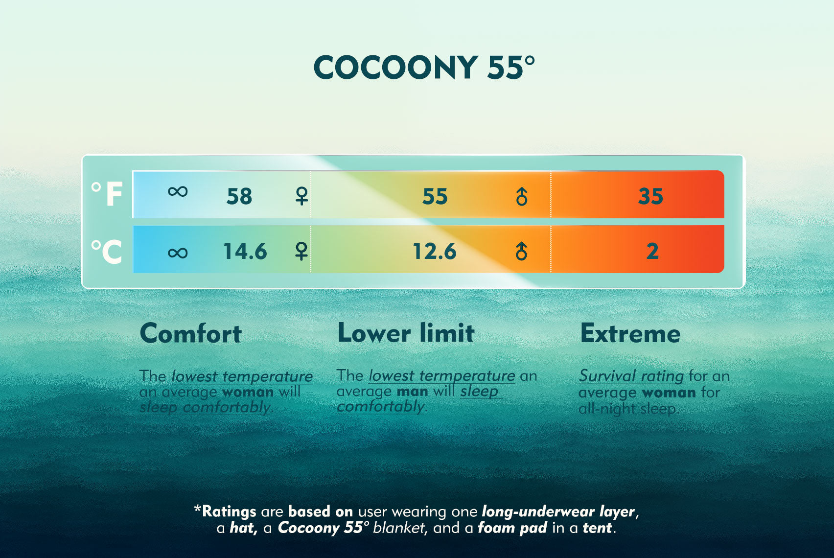 When using this blanket as a sleeping bag, please refer to this temperature rating COCOONY 55° as a guide.